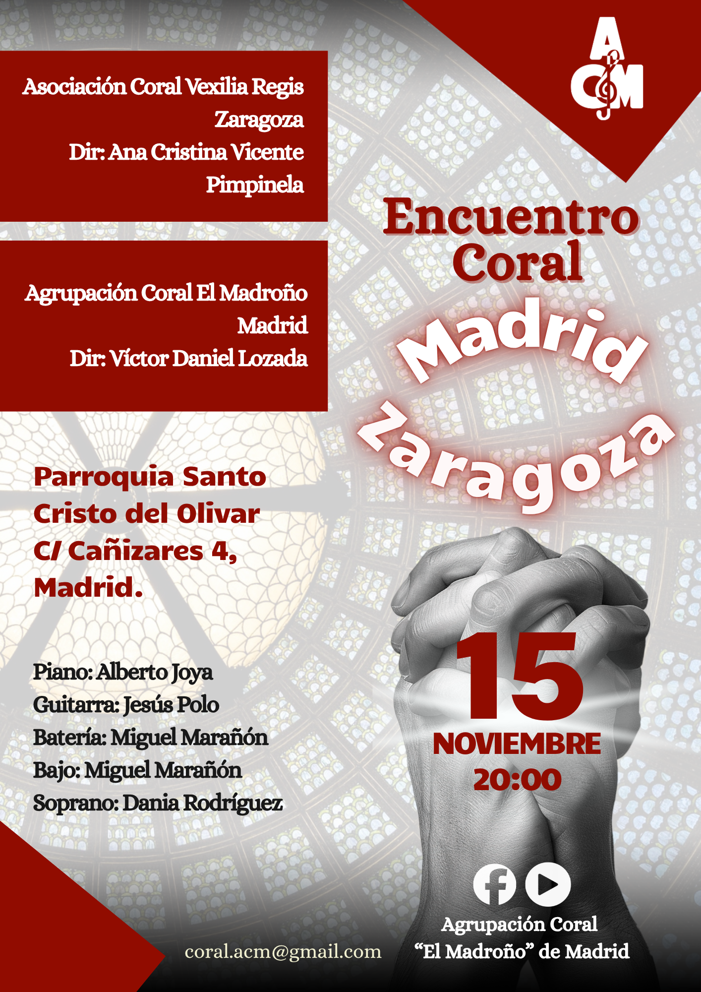 Encuentro coral entre Agrupación Coral El Madroño, de Madrid y la Asociación Coral Vexilia Regis, de Zaragoza. Un hermoso momento para la fraternidad de ambas agrupaciones. Bajo la dirección de Víctor Daniel Lozada y Ana Cristina Vicente Pimpinela, respectivamente.